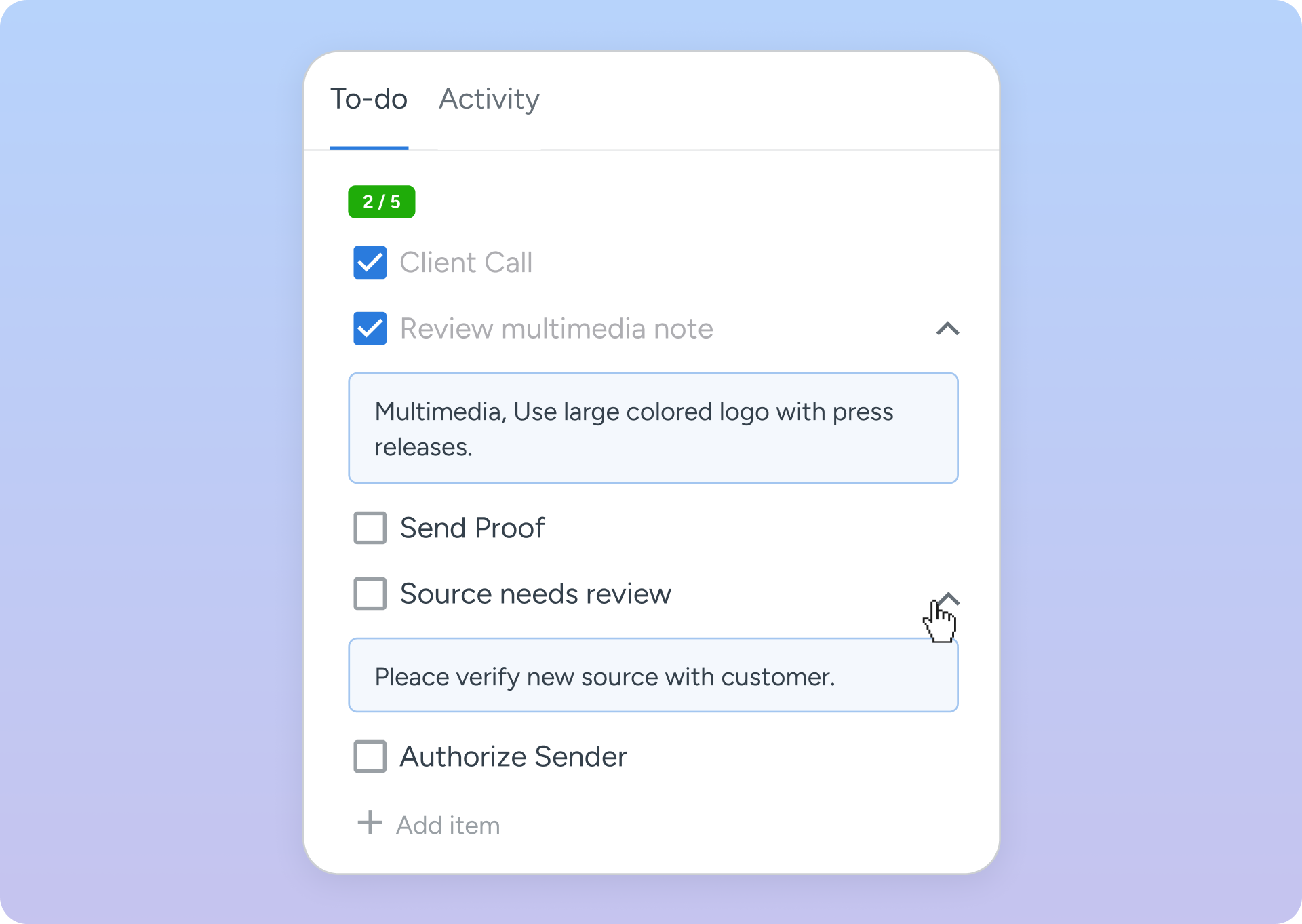 Eliminate cognitive load by listing order to-do’s Borrowing from a training document to-do list, we implemented a tasks tailored for each order